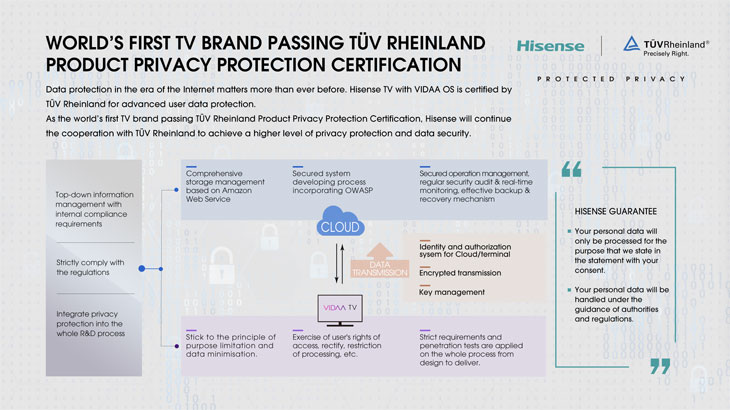 作为享誉全球的中国自主品牌,海信一直注重用户的数据保护和隐私安全,与国际领先的第三方检测、检验和认证机构TÜV莱茵进行深度合作,从终端电视、数据传输、云端服务等方面确保其搭载安卓和VIDAA U4智能操作系统的电视产品符合对个人数据保护的要求,海信更成为全球首家通过TÜV莱茵隐私保护认证的电视品牌。该背书将有助于提升海外买家、消费者对海信品牌及海信智能电视的信任,促进海信打开海外市场新局面。