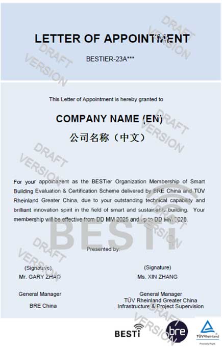 BESTier由莱茵TÜV和BRE统一规划和管理,由国际专家工作组领导和组织具体工作。根据合作人(目前仅对公司和机构开发)的行业职责分工不同,分为设计咨询工作组、设备系统工作组、运营管理工作组三个下设工作组。本合作计划旨在透过行业研讨会的组织与策划,组织专家与企业进行优秀案例和最佳实践的考察调研活动,促进智慧建筑行业交流融合。