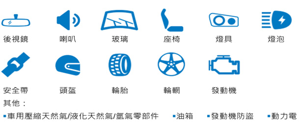 各種訊號燈和照明燈具,光源,安全玻璃,安全帶,輪胎,喇叭,後視鏡,油箱,發動機,發動機電子防盜系統,CNG,LNG及LPG部件,儲氫系統部件,動力電池,兒童座椅等。